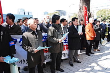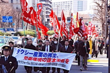 その後、松永全自交労連書記長が3月5日に行われた国交省交渉について報告し、来賓として激励に駆けつけた連合、交運労協、全タク連、民主党、社民党の各出席者から連帯の挨拶を受けました。