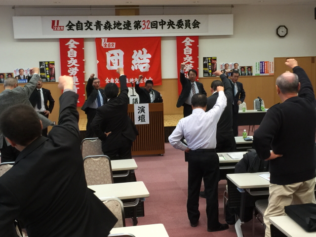 全自交青森地連(後藤勝委員長)は2月15日、青森市労働福祉会館で第32回中央委員会を開き、2016春闘方針を確立するとともに、昨年提訴した青森裁判の勝利と改正法施行以後、下限割れ運賃を採用して運賃競争を仕掛けている青森市内の悪質事業者の排除に全力を挙げることを全員で確認しました。