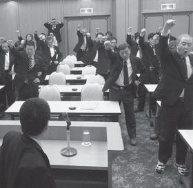 その後、自教部会を代表し、愛自学労の青山治彦執行委員長が、1月20日に行われた2016自教労組全国交流集会を報告。自教部会として、賃上げ要求を12000円とし、年間一時金の要求は100万円とする事が報告されました。第2日目は2016春闘方針案の質疑討論を行い、7名の中央委員が発言し、春闘方針案を補強し、春闘方針案は満場の拍手で採択されました。続いて、三重地連と静岡地連の本部直加盟の承認を求める第2号議案を松永次央書記長が提案し、満場一致で採択されました。その後、2016春闘アピールの提案を北海道地連の長谷川明中央委員が行い、満場の拍手で採択しました。最後に服部達彦副執行委員長の閉会挨拶の後、伊藤実中央執行委員長の音頭で団結ガンバロウを三唱して成功
