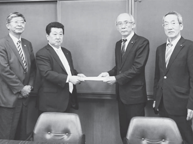 勝地市議会議長に要請書を手渡す伊藤部会長