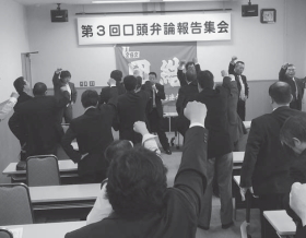 弁論終了後、青森県労働会館で報告集会を開き、青森地連の組合員の他、全自交労連の森田書記次長と高橋書記次長、東北地連の鈴木委員長、青森県交運労協の支援者らが参加しました。