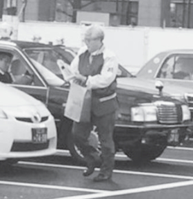 駅の乗り場で客待ちする乗務員に「初乗り距離短縮運賃の導入阻止」と「白タク合法化阻止」を訴えるビラを約700枚配布しました。