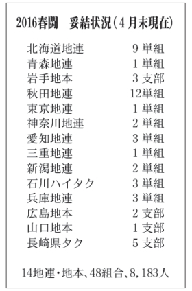 全自交労連の2016春闘は、最大のヤマ場となった4月中旬の闘いと4月18〜28日に設定した解決促進ゾーンで交渉を追い込み、4月末現在で14地連・地本、48組合・支部が妥結に至りました。