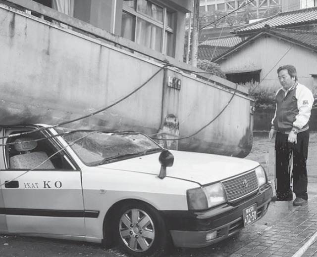 社屋が激しい揺れにより倒壊した瞬間にもタクシー車両1台の運転席には組合員が乗車していましたが、助手席側は大破したものの運転席は奇跡的に空間が確保され、負傷することなく脱出し、一命をとりとめました。
