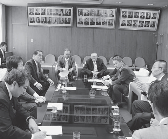 松山市議会議長(左側奥)と意見交換する参加者