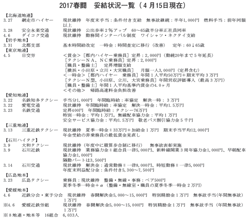 全自交労連が4月15日までに集約した全国の妥結状況は、北海道地連(3組合)、岩手地本(1支部)、東京地連(1組合)、愛知地連(3組合)、三重地連(1組合)、石川ハイタク(3組合)、広島地本(1支部)、愛媛地本(2分会)の8地連・地本、14組合と愛媛近鉄労組が妥結しました。この内、3月内に決着した組合は6地連・11組合となっています。