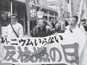 集会後、参加者は青森市内の中心部をデモ行進し「ストップ原発」を道行く市民に訴えました。