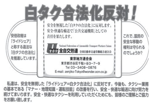 さらに、「白タク合法化の動きは、本年が正念場となる」との認識を示し、絶対阻止に向け運動強化を呼びかけました。