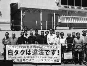 沖縄県ハイヤー協会は、船から降りて街に出ていく観光客に「白タクは違法です」と横断幕で訴えるとともに、白タクの危険性を訴えるパンフレットも作成して注意を喚起する取り組みも行っています。今後の対策としてタクシーで多言語のタブレット開発も予定されています。