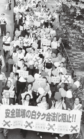 集会後、参加者は赤坂までのパレードに出発。沿道の市民の注目も高くアピール力あるパレードとなりました。