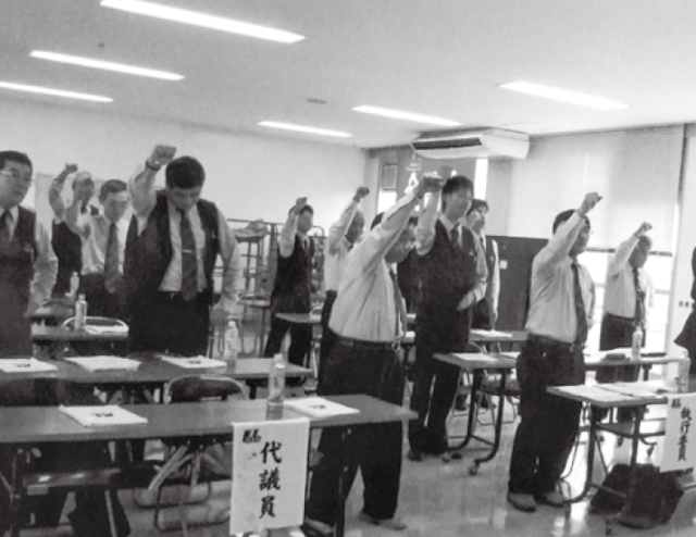 最後に河合信人新執行委員長の音頭で新年度に向けた力強い運動を展開する意思を感じる団結ガンバロウ三唱で大会を終えました。
