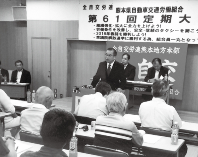 執行部を代表し西本俊昭委員長があいさつし、衆議院の解散総選挙での奮闘を参加者に呼びかけるとともに「熊自交60年の歴史の中で諸先輩は組織の拡大強化とタクシー労働者の地位・労働条件向上を取り組んできた。私たちはこの運動を継承し、熊自交組織の強化・発展のためにこの間運動してきた。しかし、決定的な成果を出すことはできないでいるのも事実。運動の再点検し、組織の強化・拡大と労働条件向上に奮闘しなければならない」と訴えました。