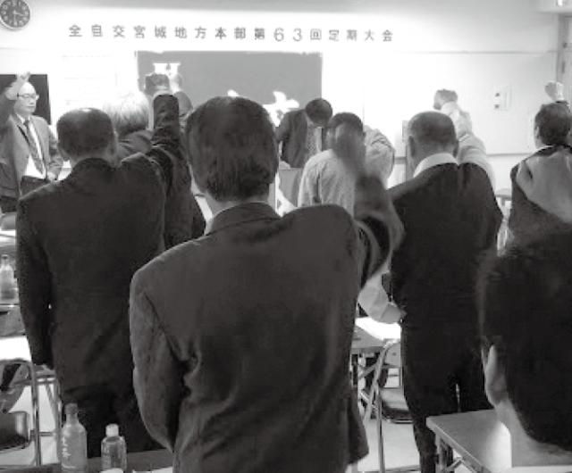 宮城地方本部は10月22日、七郷市民センターで第63 回定期大会を開きました。大会は鈴木代議員と小野代議員を大会議長に選出して進められ、主催者代表挨拶で嶺岸委員長は、過疎地でのライドシェア導入阻止を呼びかけるとともに青森裁判と22年ぶりの運賃改定を報告し、この運賃改定を追い風に「頑張ろう」と訴えました。大会には衆議院選挙の投票日にもかかわらず、連合宮城、交運労協、全自交東北地連らの各代表者と辻仙台市議が激励に駆けつけ、連帯の挨拶を行いました。全自交労連の高橋書記次長が講演した後、戸村書記長が新年度運動方針を提案。運賃改定と下限割れ運賃に対する質疑・討論を経て満場一致で新年度運動方針を確立しました。