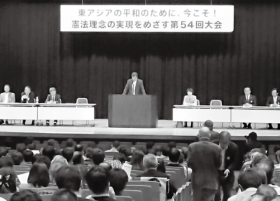 憲法理念の実現をめざす第54回護憲大会が11月28日から3日間、東京都内の日本教育会館を会場に「東アジアの平和のために、今こそ!憲法理念の実現をめざす」のテーマで開かれ、全国から約700人が参加しました。全自交労連から開催地の東京地連をはじめ、全自交本部、青森地連、岩手地本、愛媛地本の仲間が積極的に参加し、安倍政権による改憲発議を阻止し、平和憲法を守り広める運動の強化を誓い合いました。