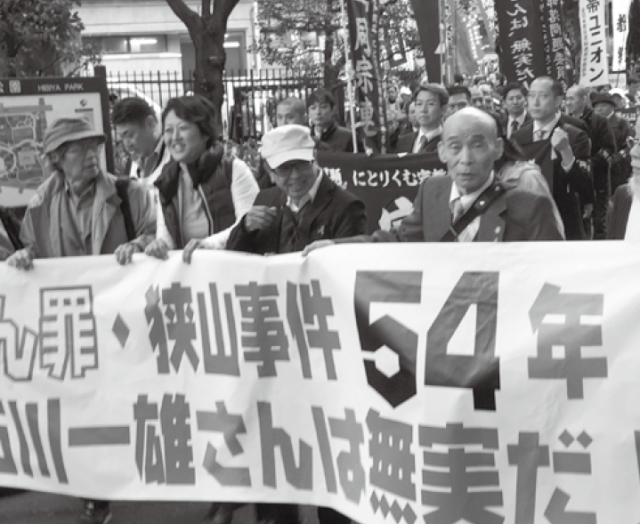 集会後、参加者は「えん罪・狭山事件54年!石川一雄さんは無罪だ!」の横断幕を先頭に、新橋・有楽町・東京駅八重洲口前をデモ行進し、「見えない手錠をはずせ」と道行く市民に訴えました。