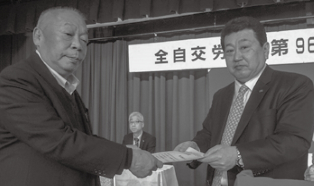 中央委員会の第2日目に行われた功労者表彰で伊藤実中央委員長から感謝状を受け取る熊本地本の重光重信さん(写真左)
