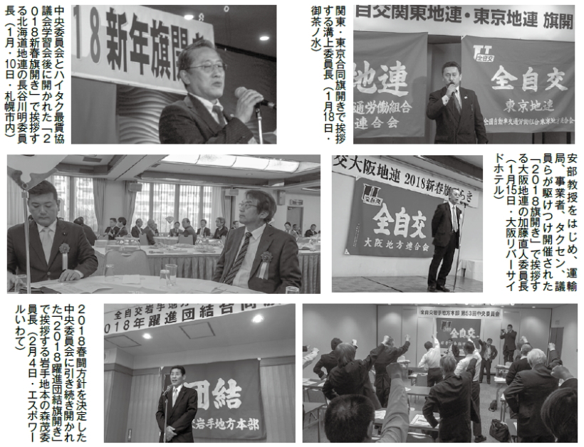 全自交労連は1月23~24日、静岡県伊東市で第96回中央委員会を開き、「全ての職場から立ち上がる2018春闘!地域交通を担う魅力あるタクシーに再生しよう!違法な白タク摘発!安全と労働を壊す白タク合法化阻止!」のスローガンを掲げ、格差是正に向け、月額1万円の賃上げ要求と一時金・退職金大幅改善を柱に、労働者のための「働き方改革」で安心して働き暮らせる賃金水準の獲得を参加者全員で誓い合いました。