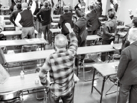 大会は2018年度運動方針案・予算案等の全ての議案と役員改選案が満場で承認され、最後に正岡委員長の団結がんばろうで終了しました(写真)。