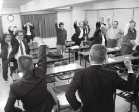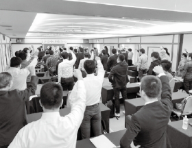 また、高知県から意見書を出すように早急に働きかけを強めたいという思いを述べました。その後、全自交労連の森田書記次長がタクシー産業における現状の課題を講演した後、議事では新年度の予算案・運動方針案がすべて承認されました。最後に傍士委員長の団結がんばろうで大会を終えました(写真)。