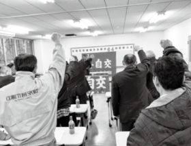 その後、東北地連の森書記長、連合青森、交運労協等の多数の来賓が連帯挨拶を行いました。続いて、全自交労連の高橋書記次長が講演。江良書記長が新年度運動方針を提案し、満場一致で承認されました。最後に団結ガンバロウで大会を締めました(写真)。