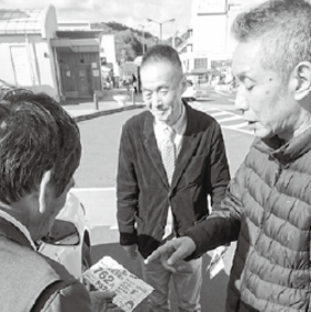 宮古市での行動後、大船渡市盛駅前に移動。連合岩手・気仙地協の星正和事務局長も合流してチラシ配布とオルグ活動を行いました。