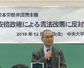 日本労働弁護団は2018年12月14日の夕刻、都内の中央大学駿河台記念館で「安倍政権による憲法改悪に反対する集会~平和と労働運動を守