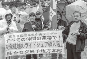 4月27日、小雨が降る天候のもと、盛岡市の盛岡城跡公園で第90回岩手県中央メーデーが開かれ、2000人が参加しました。全自交岩手地本からも「ライドシェア導入阻止」の横断幕を掲げて積極的に参加しました(=写真・左)。
