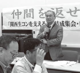 支援する会の結成総会終了後、同じ会場で報告集会が行われ、関西弁護団の位田浩弁護士と関生支部の組合員がこの間の不当弾圧との闘争報告を行いました。その後、支援団体である平和フォーラムや産別労組らの代表らが連帯の意思を表明しました。全自交労連からは森田書記次長が連帯と激励の挨拶を行いました。参加者は戦う決意を固め集会を終えました。