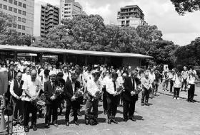 各政党・団体の代表からは、立憲民主党の近藤昭一衆議院議員が、枝野幸男・立憲民主党代表の談話「74回目の終戦の日にあたって」を代読しました。また、吉田忠智・社会民主党参議院議員は「敗戦74年にあたって」の声明を読み上げるとともに、阿部知子・立憲フォーラム副代表(衆議院議員)は「慰霊と誓いのことば」を述べました。戦争をさせない1000人委員会事務局長の内田雅敏弁護士が「戦後74年8月15日」の言葉を語られた後、主催者、参加団体の代表、参加者が献花を行いました。