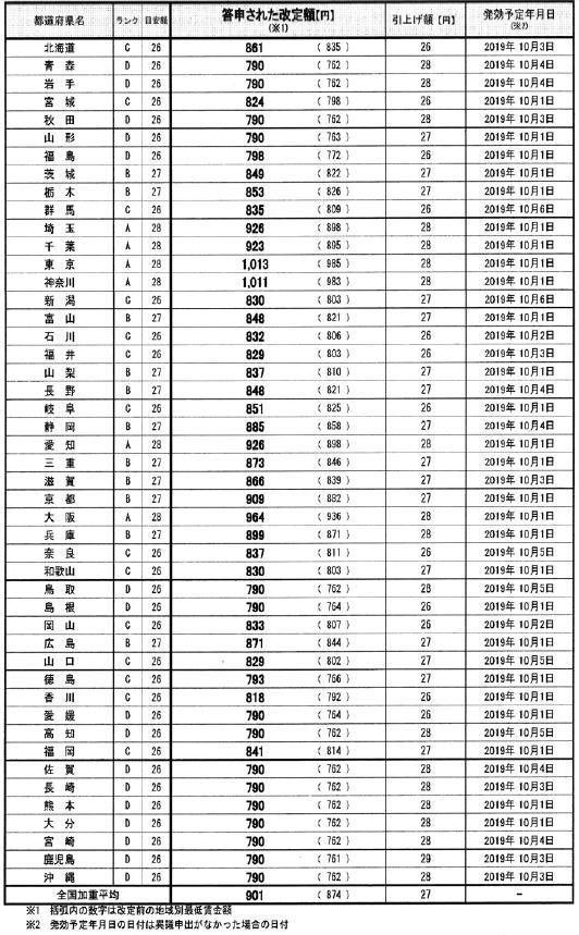 改定額の全国加重平均額は901円(昨年度は874円)で引上げ額の全国加重平均は27円(昨年度は26円)となり、1978年度に目安制度が始まって以降で最高額となるとともに、東京都(1013円)と神奈川県(1011円)で初めて時間額1000円を超えました。