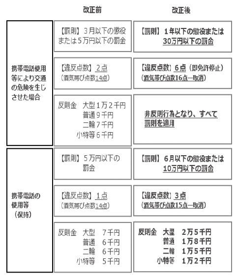 また、スマホ等を使用して事故等の危険に結びついた場合は即免許停止処分になるとともに、酒気を帯びて使用(保持)したら即免許取消処分となります。