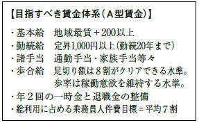 ●長時間労働を是正させると同時に、時間外労働の削減により給与総額が低下しないよう効率的な勤務時間・休日の設定と所定内賃金の時間単価引き上げを求める、等を提案するとともに、「目指すべき賃金体系」を示し、A型賃金への転換・拡大を2020春闘方針に掲げました。