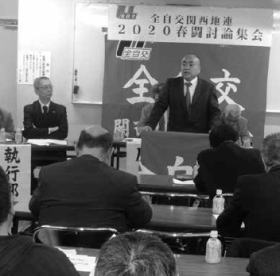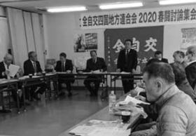 全自交四国地連は2月18日、愛媛地本会議室において2020春闘討論集会を開き、冒頭、挨拶に立った傍士帯夫執行委員長(写真中央)は、「タクシー労働者は、依然として長時間労働・低賃金にさらされている。高知では2月1日から運賃改定がされた。これを好機ととらえ春闘勝利につなげたい。乗務員不足の解消のためにも賃金・労働条件改善に向け粘り強く交渉しよう。また、タクシー産業の存立基盤を脅かす白タク・ライドシェア合法化を絶対阻止しなければならない。全組合員が団結して取り組もう」と訴え、事業者に対し賃金・労働条件の改善とタクシー事業の適正化と再生に向けた施策を求めるとしました。