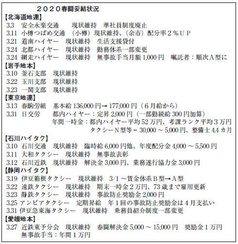3月31日までの集約では、北海道地連の5組合、岩手地本の3組合、東京地連の2組合、石川ハイタクの3組合、静岡ハイタクの5組合、愛媛地本の1組合が妥結しました。妥結組合は合計で19組合。組合員数では5581人となっています。