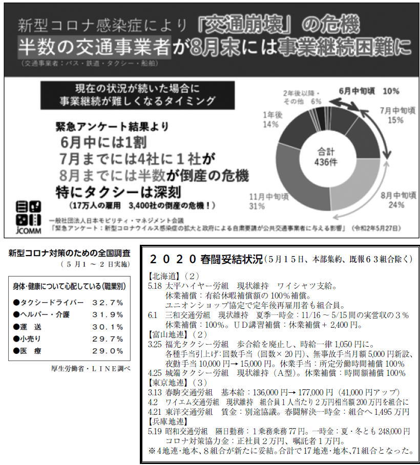 また、売上が激減した4月から、多くのタクシー会社が部分的な休業に追い込まれました。中には雇用維持の努力なしに、解雇に走る悪質事業者も現れましたが、絶対に許すわけにはいきません。今解雇され路頭に投げ出されたらタクシーへの再就職はもちろん「コロナ失業」が拡大する社会で生活を維持するのは困難であり、雇用を守る闘いは最重要の闘いです。