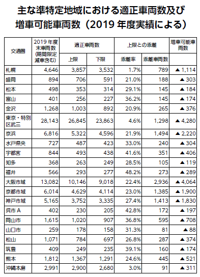 準特定地域における需給状況・適正車両数は、毎年8月末に各運輸局から公示され、前年度(今回は2019年4月~2020年3月)の輸送実績にもとづいて計算されますが、120全ての準特定地域で供給過剰状態にあり、増加可能車両数はありませんでした(左表参照)。適正車両数(上限)との乖離率が最も高かったのは福井交通圏(48・2%)で最も乖離車両数が多い地域は大阪市域交通圏(2936台)でした、増車可能車両数は東京・特別区武三交通圏で▲4064台を記録しました。