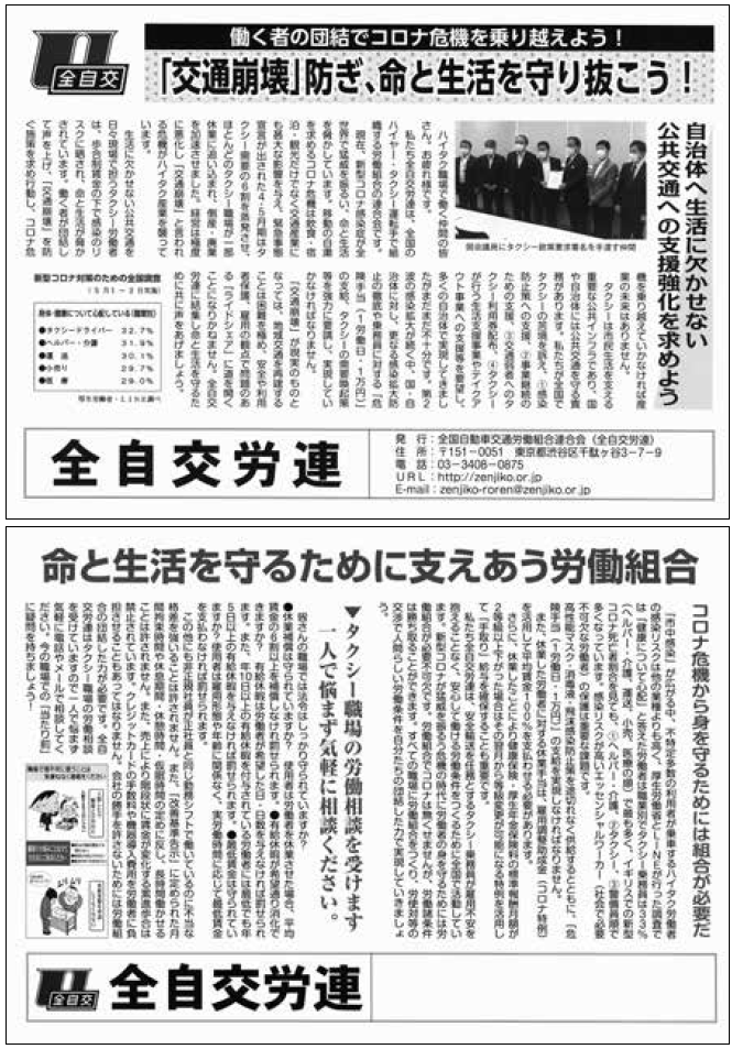 運動方針案については、「コロナ危機を団結した力で乗り越えよう」「交通崩壊を阻止し、雇用・労働条件を守り抜こう」「ライドシェア導入を許さず、生活に欠かせない地域公共交通を自治体・住民とともに創出しよう」をメインスローガンに掲げ、①乗務員の感染防止策の徹底、②国・自治体に対するタクシー支援策の強化、③安心して生活できる賃金や休業手当・危険手当の確立、④白タク・ライドシェアの導入阻止、⑤労基法違反の一掃と「同一労働・同一賃金」の実現、⑥白ナンバー有償輸送の安易な拡大阻止、⑦コロナ危機に無為無策な政権を打倒し政権交代の実現、⑧全自交の組織拡大・強化、をサブスローガンとする事としました。
