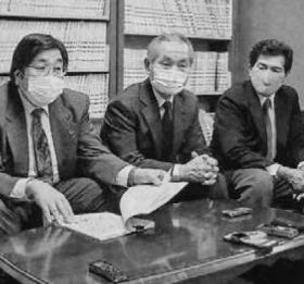判決後、記者会見する原告の青山治彦さん(中央)、