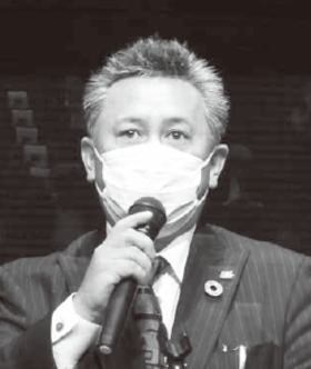 中川委員長は1年前に急逝した宮沢勝正前委員長を偲び、後を継いでからのコロナ禍の厳しい1年間を振り返りました。その上で「選挙に打ち勝ちタクシー産業の政策を通していきましょう」と呼びかけています=写真。