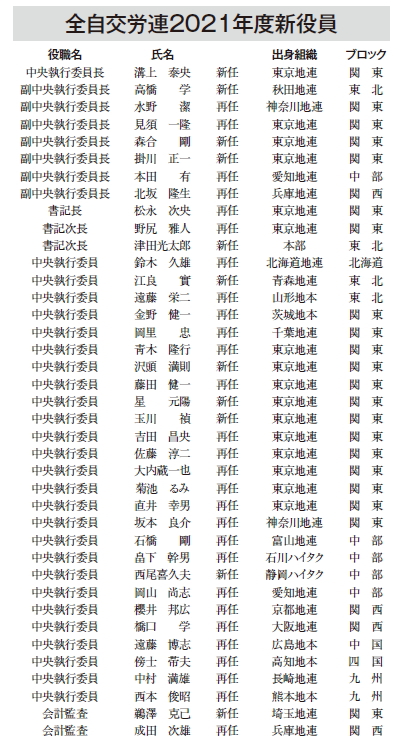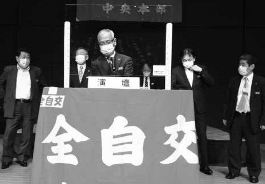 全自交東京地連(藤野輝一委員長)は10月29日、東京都の全電通労働会館で第124回定期大会を開き、運賃改定実現や、ライドシェア反対、定額乗り放題mobi(モビ)への警戒などを重視する2021年度運動方針や予算を確立しました。役員改選では見須一隆副委員長(京自労)が新委員長に就任。新副委員長に森合剛(大和自交労組)、掛川正一(帝都自交労組)両執行委員が選ばれました。ほか3人の副委員長は再任です。来賓として本部の溝上泰央委員長、伊藤実前委員長や、連合東京の杉浦賢次会長、東京交運労協の反町茂雄議長ら多数が出席しました。