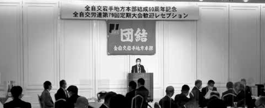 全自交岩手地本(森茂委員長)は、大会前日の18日、盛岡市のホテルニューカリーナで岩手地本結成60周年記念と全自交労連79回定期大会歓迎を兼ねたレセプションを開催し、連合岩手の佐々木秀市会長をはじめとする多数の来賓と大会参加者をもてなしました。