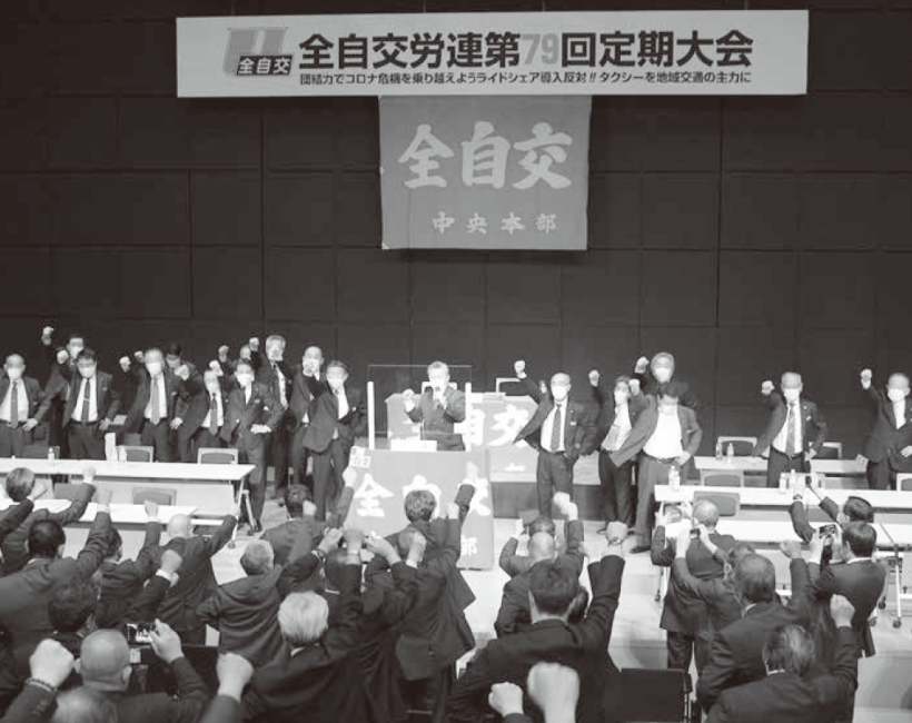 全自交労連は10月19日と20日の両日、盛岡市の岩手県民情報交流センター(アイーナ)で第79回定期大会を開催し、溝みぞがみ上泰や すお 央中央執行委員長をはじめとする新執行部を発足させました。全国から約210人の仲間と多数の来賓が駆けつけ、10年前、組織分裂の要因となった第67回大会と同じ会場で団結の回復を祝し、いまだ復興が道半ばの東日本大震災被災地への思いを込めた意義深い大会となりました。コロナ危機を乗り越えて雇用と賃金を守り、タクシーを地域交通の主力と位置づけ、ライドシェア導入に反対する新年度運動方針を確立するとともに、衆議院選挙勝利に向けた総決起を誓い合いました。