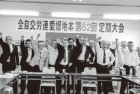 運動方針では労働条件の改善や機関紙の「全自交えひめ情報」の発行、平和運動への参加等に力を入れることを確認し、最後に団結ガンバロウを三唱して閉会しました。