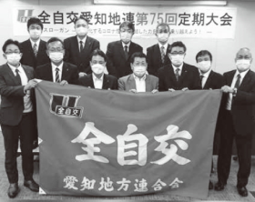 全自交愛知地連(本田有委員長)は10月6日、名古屋市熱田区のワークライフプラザれあろで、第75回定期大会を開催し、雇用確保とタクシー事業の存続、組合員の生活給確保を中心とした新年度運動方針・予算を確立しました。規約を改定し、準加盟制度を新設。新たに準加盟として名鉄西部交通労働組合、文化交通ユニオン労働組合、名鉄名古屋タクシー労働組合、名鉄岡崎タクシー労働組合、名鉄四日市タクシー労働組合の5組織の加入が承認されました。来賓として伊藤実全自交労連委員長が駆け付け、激励の言葉を述べました。