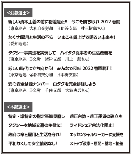 2022春闘のスローガンは「危機突破 2022春闘で未来への一歩を ハイタクの将来は賃上げにあり」、「『交通崩壊』絶対阻止!タクシーこそ地域交通の主役に」。コロナ禍での需要減少や燃料費の高騰など、今春闘をめぐる情勢は厳しいものですが、歩合給主体のタクシーは売上が賃金低下に直結し、他産業との年収格差はさらに拡大、すでに多数の退職者が出ています。この危機を突破し産業全体の崩壊を防ぐ方法は、賃金・労働条件の回復以外にありません。なんとしても春闘で賃上げを勝ち取りましょう。