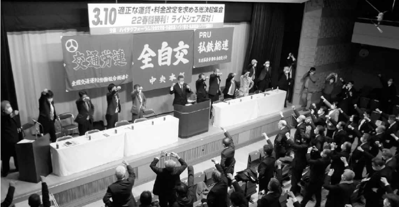 全自交労連、交通労連ハイタク部会、私鉄総連ハイタク協議会で構成するハイタクフォーラム(代表=溝上泰央全自交労連中央執行委員長)は3月10日、東京・永田町の星稜会館で「適正な運賃・料金を求める総決起集会22春闘勝利!ライドシェア反対!」を開催。全国から167人の仲間が集結し、コロナ禍を乗り越え、賃金・労働条件を改善するためには運賃改定が必要と声を揃えました。連合の清水秀行事務局長をはじめとする15人の来賓からも連帯が表明されています。9日に厚生労働省・国土交通省への要請行動、10 日の集会後には、タクシー政策議員連盟との意見交換も実施。ハイタク労働者の苦境を訴え、改善を求めました。