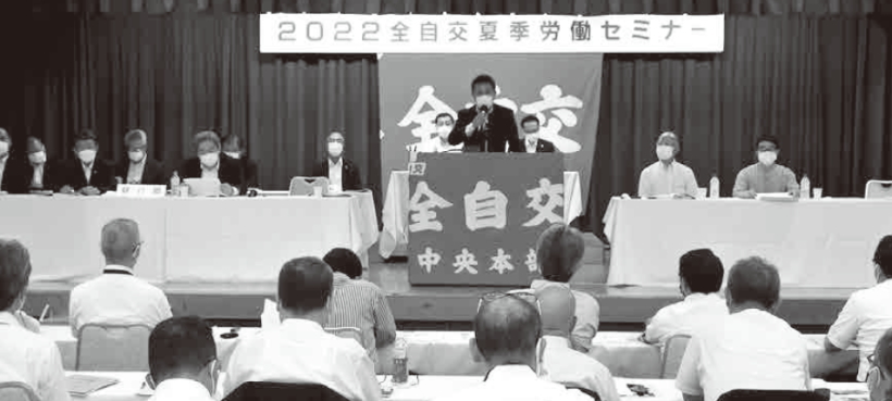 全自交労連は7月11、12日、静岡県伊東市のホテルジュラクで2022夏季労働セミナーを開催し、全国から193人が参加しました。初日は、交運労協の慶島譲治事務局長、東京共同法律事務所の木下徹郎弁護士、国土交通省自動車局旅客課の梅田智タクシー事業活性化調整官が講演。2日目には松永次央書記長が、運動方針のたたき台となる討議課題を提案し、春闘の取り組みを報告しました。