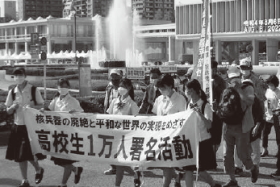 広島大会の初日、高校生平和大使を先頭に、折り鶴平和行進を行い、約1200人が参加した開会総会で、被爆者の切明千枝子さんの証言などを聞きました。