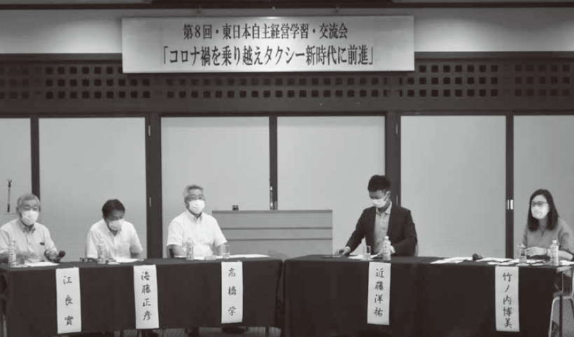 また、今年は「コロナ禍を乗り越えタクシー新時代に前進」をテーマに、初のパネルディスカッションを開催。近藤社長と東京交通新聞社の竹ノ内博美記者、全自交東北地連の高橋学委員長、江良實書記長、全自交新潟地連の海藤正彦書記長の5人をパネラーにして、各地・各社の抱える課題と取り組みについて意見交換しました。デマンド交通の受託やタクシーへの補助金の獲得など、自治体との連携の好事例についても意見交換しています。