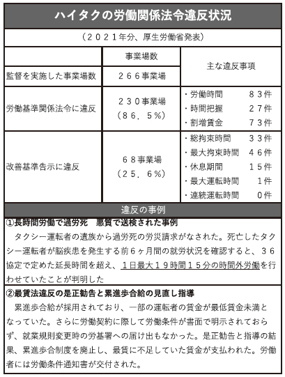 ハイタク職場は、常に労働基準法違反率が高く(表参照)、法令を無視し、労働者を犠牲にする悪質事業者を許してはならない。最低賃金をはじめとした法令違反に対し、すべての職場と地域で、監視・摘発に取り組む。